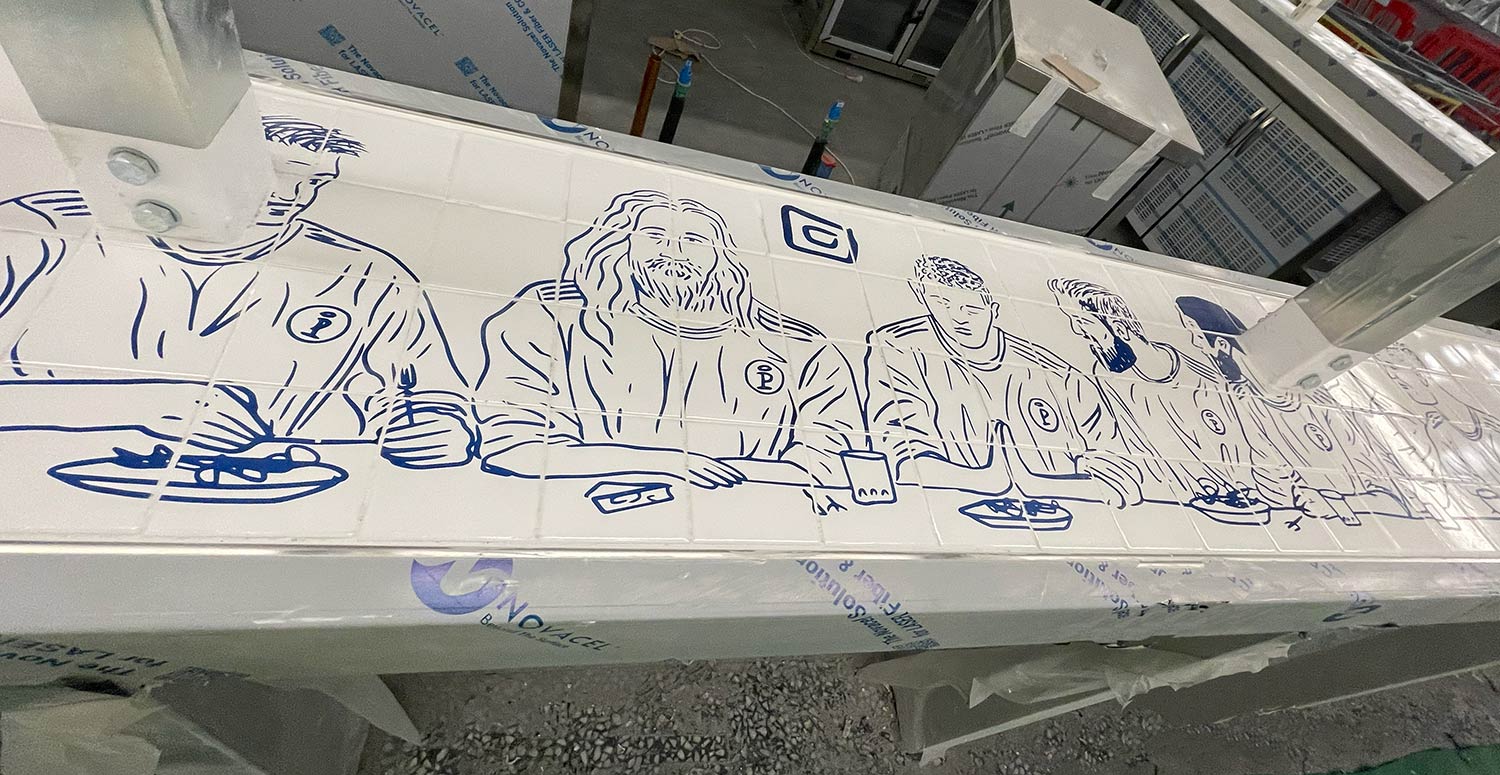 En ella, se fusionan conceptos propios de Beata Pasta con referencias al fútbol, generando un lenguaje visual único y coherente con el entorno.