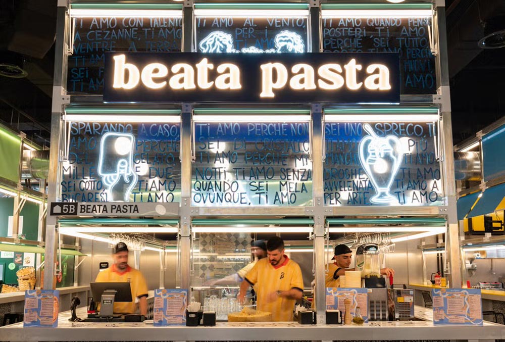 En colaboración con el equipo de Beata Pasta, el estudio de Alejandra Pombo y la constructora 4Retail, Graffitensis dio vida a este espacio dentro de Bernabéu Market, desarrollando una propuesta artística inspirada en el fútbol y el universo creativo de la marca.