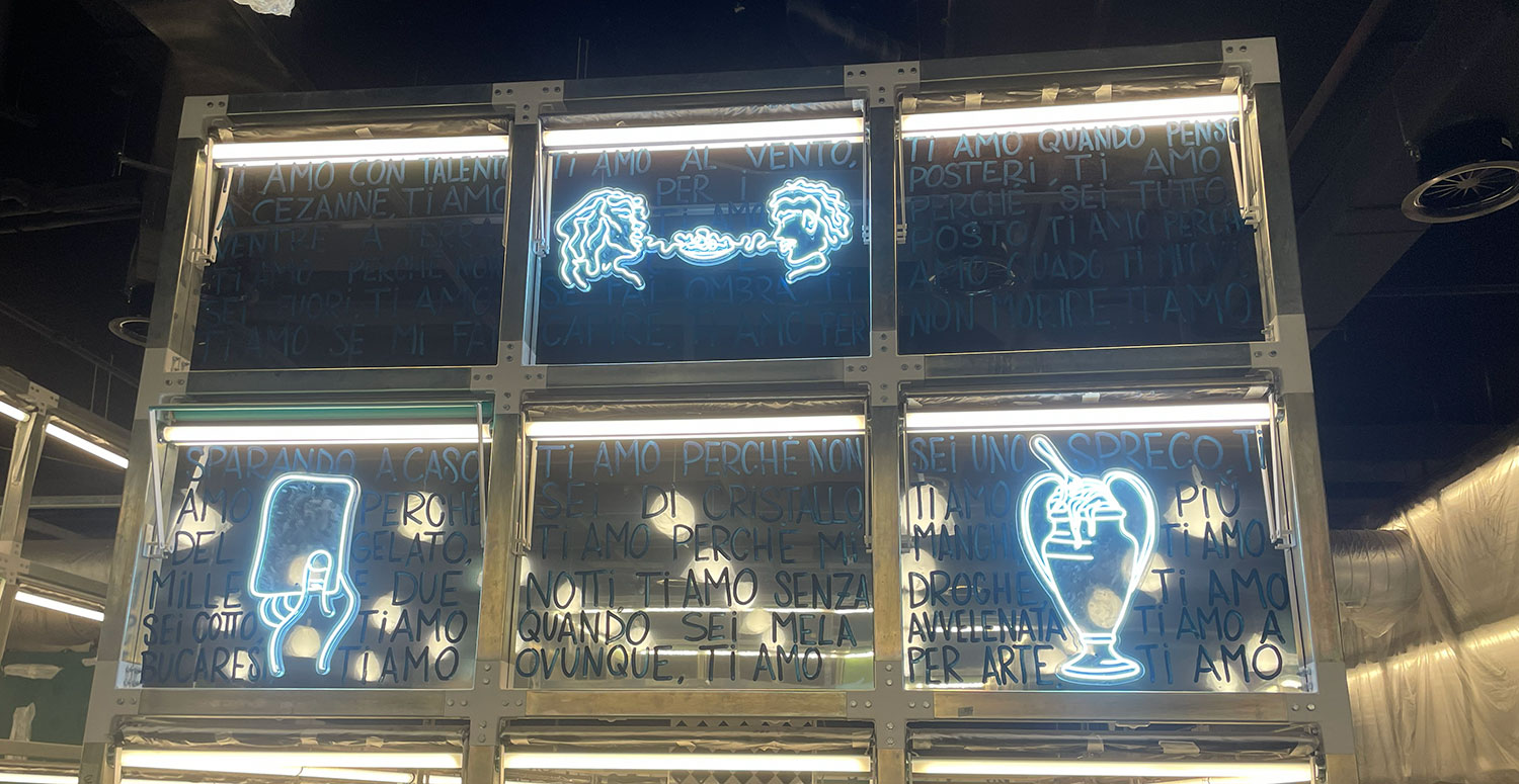 La intervención de Graffitensis combina murales de poesía sobre metacrilato, integrados con neones, junto con el diseño y producción de una barra de azulejos completamente personalizada.